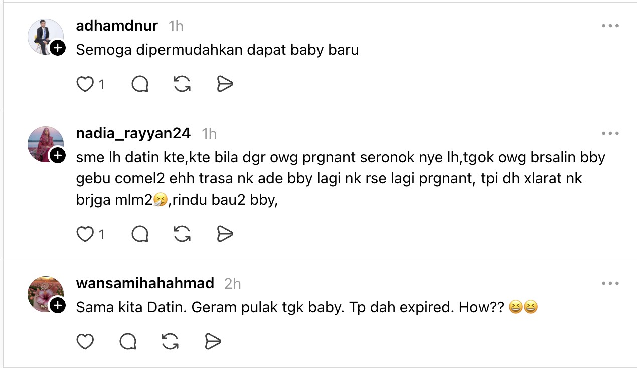 Perkongsian tersebut menerima pelbagai reaksi daripada warganet yang rata-ratanya memahami perasaan seorang ibu, malah ada yang turut mendoakan agar hasrat Shahida untuk menimang cahaya mata lagi dipermudahkan.