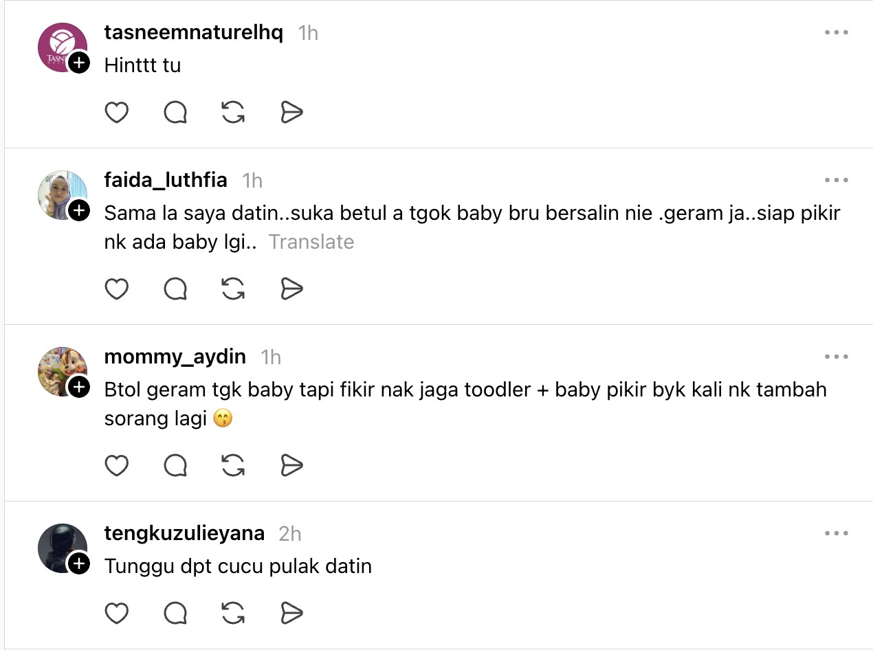 “Naluri mak-mak ni tengok orang dapat baby, kita pun nak juga tapi dah tua,” ciapannya, hari ini.