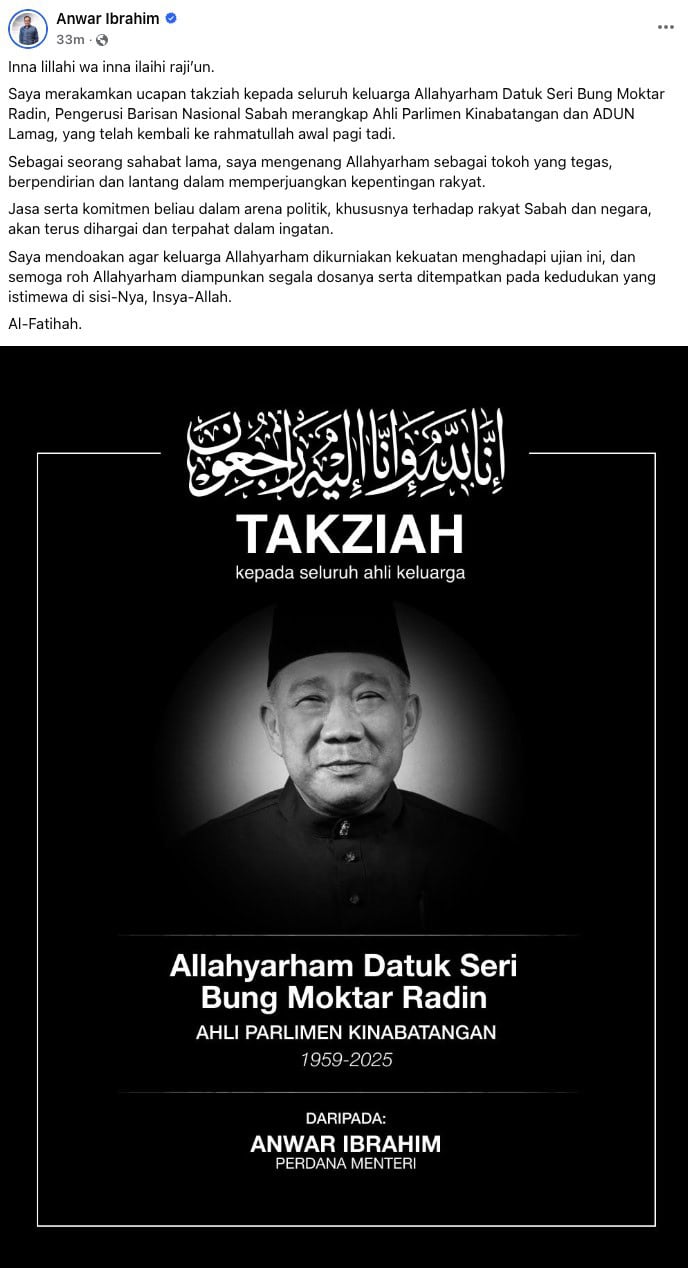 “Saya merakamkan ucapan takziah kepada seluruh keluarga Allahyarham Datuk Seri Bung Moktar Radin, Pengerusi Barisan Nasional Sabah merangkap Ahli Parlimen Kinabatangan dan ADUN Lamag, yang telah kembali ke rahmatullah awal pagi tadi.