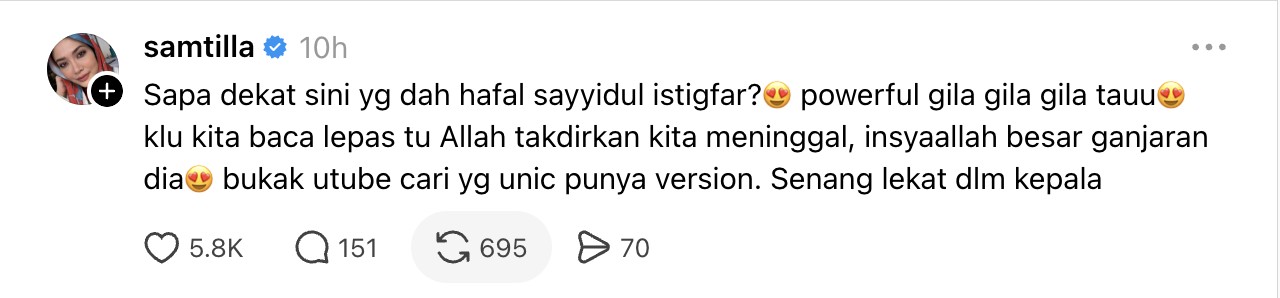 “Siapa dekat sini yang dah hafal sayyidul istighfar? Power gila tau. Kalau kita baca lepas itu Allah takdirkan kita meninggal, insyaAllah besar ganjaran dia,” ciapannya di Threads, hari ini.