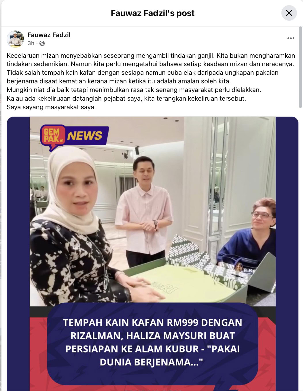Dalam pada itu, Ahmad Fauwaz turut menjemput individu yang dikaitkan dengan pembelian kain kafan berharga RM999 berkenaan supaya hadir ke pejabat beliau sekiranya terdapat kekeliruan dalam isu terbabit.