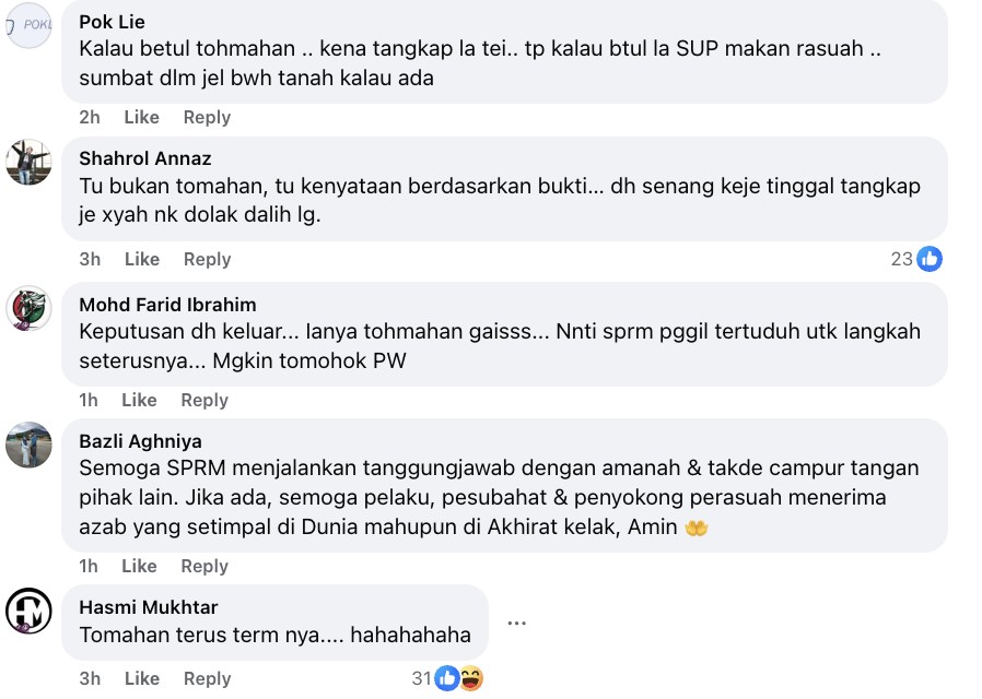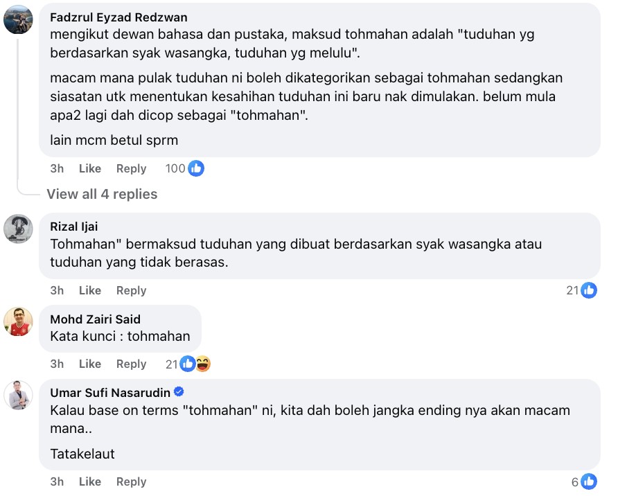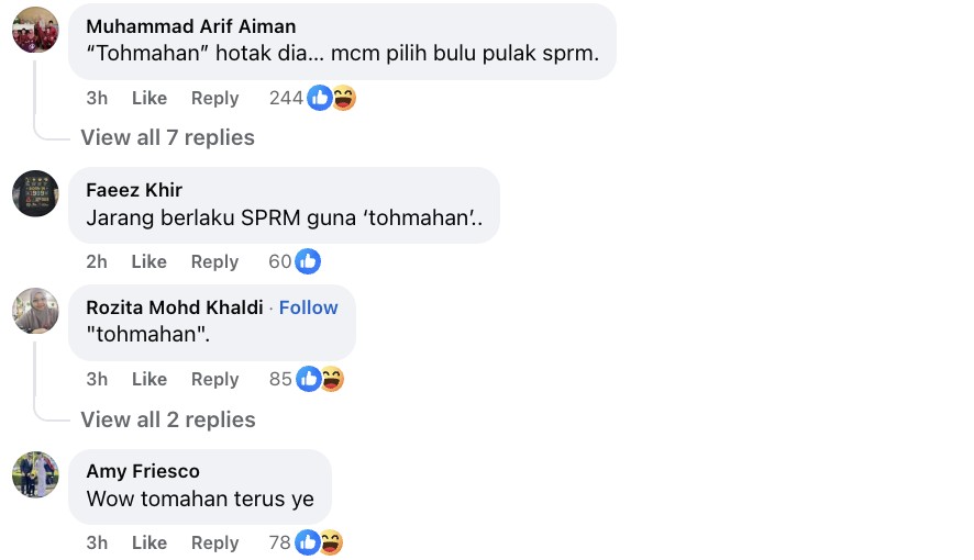 Isu ini turut menarik perhatian warga maya apabila perkataan “tohmahan” dipertikaikan di Facebook SPRM kerana dianggap memberi konotasi negatif sebelum siasatan dilakukan.
