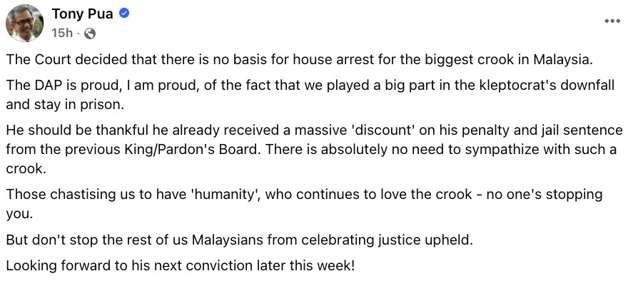 “Langsung tidak perlu untuk bersimpati dengan penyangak seperti ini,” katanya dalam hantaran di media sosial. Tony Pua menambah, “Mereka yang memarahi kami supaya ada ‘perikemanusiaan’, yang terus menyayangi penyangak itu — tiada siapa menghalang kamu.