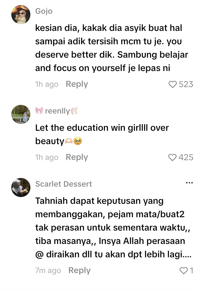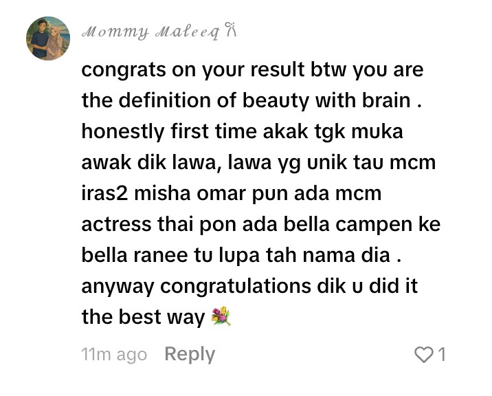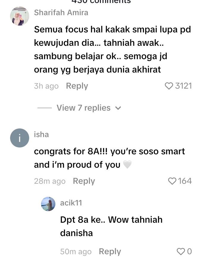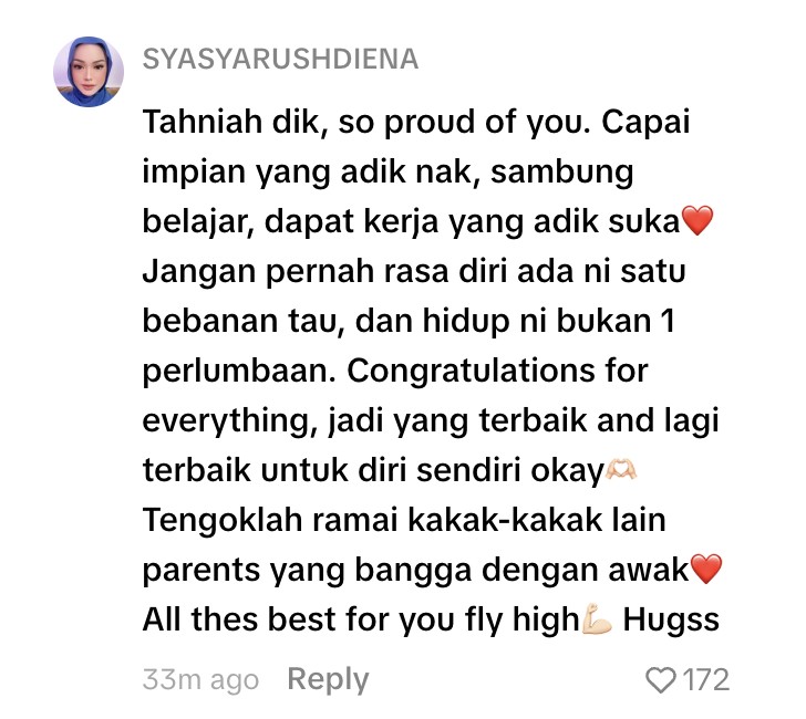 Mereka juga tidak henti mengucapkan tahniah atas kejayaannya mengecapi keputusan cemerlang dalam  Sijil Pelajaran Malaysia (SPM), baru-baru ini.