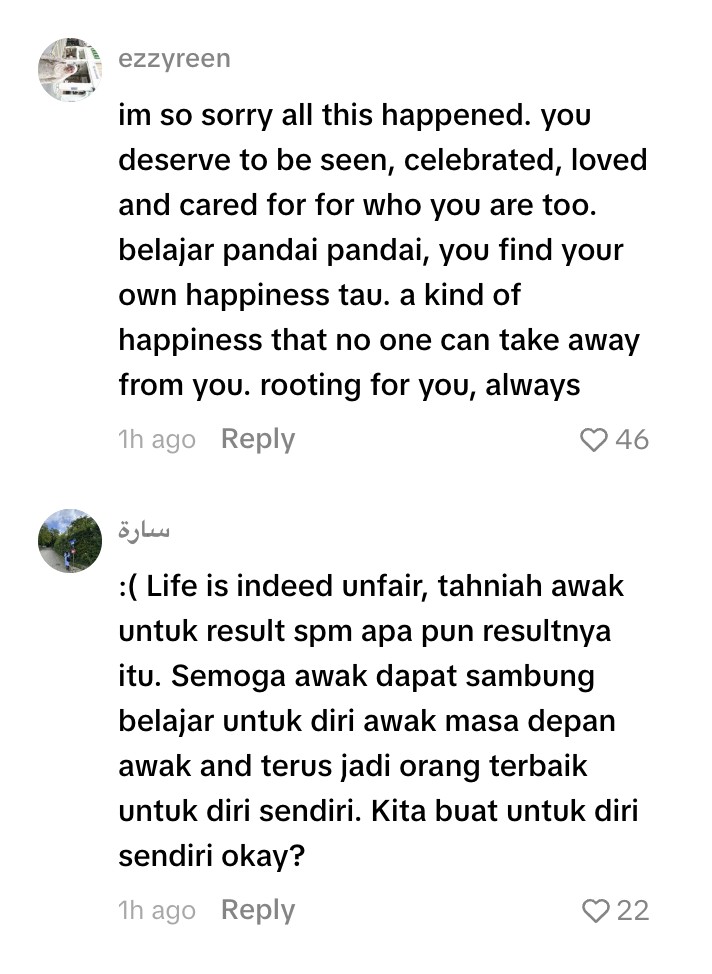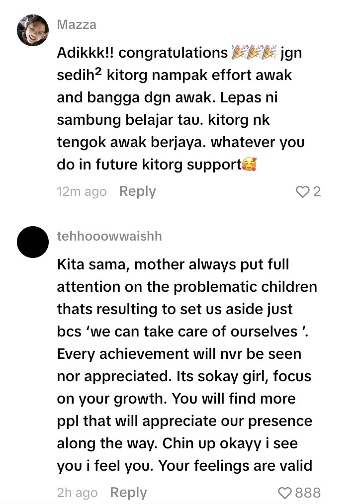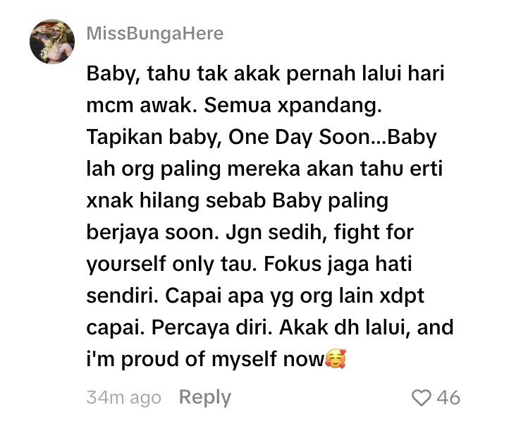 Luahan tersebut mendapat perhatian ramai yang rata-rata memberikan sokongan serta kata-kata semangat, selain mengakui setiap usaha, walaupun dilakukan secara senyap, tetap layak untuk dihargai.