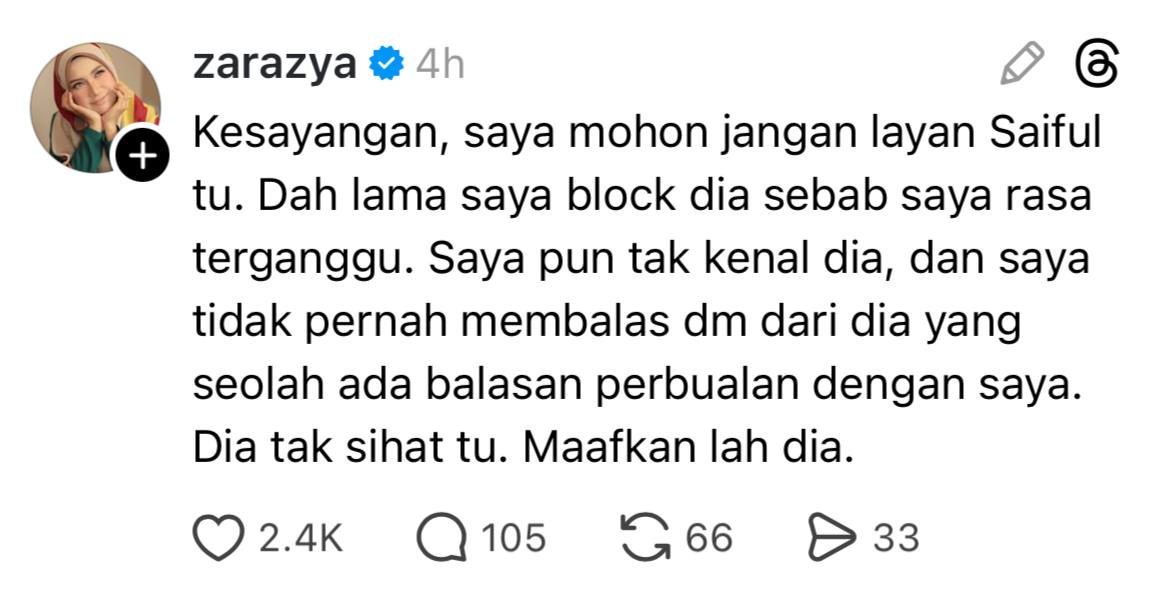 “Saya pun tak kenal dia, dan saya tidak pernah membalas DM dari dia yang seolah ada balasan perbualan dengan saya. Dia tak sihat tu. Maafkan lah dia,” ciapan Zara, hari ini.