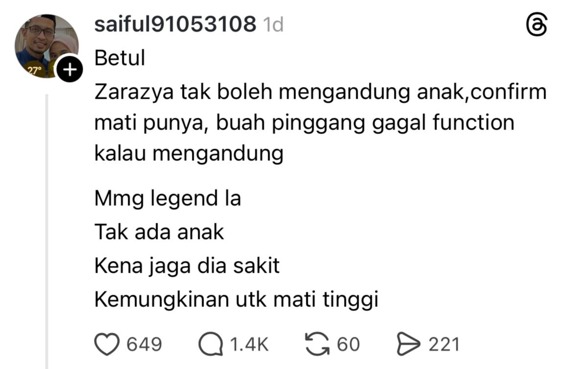 “Zara Zya tak boleh mengandung anak, confirm mati punya, buah pinggang gagal function kalau mengandung memang legend lah.